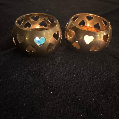 Selger 3 lysholdere / lysestaker i messing, med utskårne hjerter. Gir fine gjenspeil av hjerter på vegg/ bord. Er fra 1980 - tallet