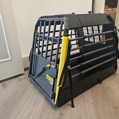 Selger et VarioCage Enkeltbur L+ i svært god stand. Buret har vært brukt i en Tesla Model Y til en golden retriever hann på ca. 38 kg, og har fungert utmerket både på korte og lange turer.