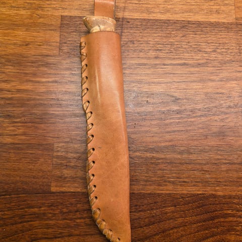 Ny håndlaget brukskniv til salgs (ref 286). Bladet, som er 85 mm, langt er håndsmidd av knivsmed Arild Mauseth. Skaftet er lager av masurbjørk og har frontholk av stabilisert eik og med ilegg av sølvtinn. Det er montert en micromosaikk pin i sort og messing med rådyrmotiv. Slira er sydd av masurlær og har dangler beltefeste slik at kniven henger mer tilgjengelig i belte.