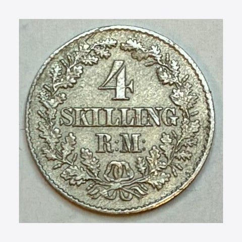 4 skilling banco mynt fra 1849 i kobber. Den ene siden har påskriften «4 skilling banco 1849» omgitt av eikeblader. Den andre siden viser portrett av Kong Oscar I Sveriges og Norges monark med teksten rundt kanten. Egner seg som samlerobjekt for eldre skandinaviske mynter og numismatikk. En meget pen og tydelig mynt.