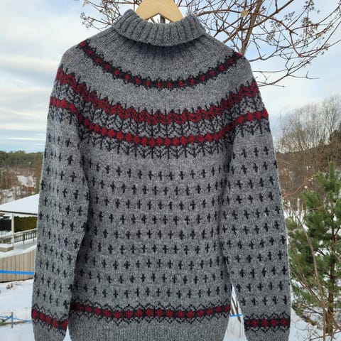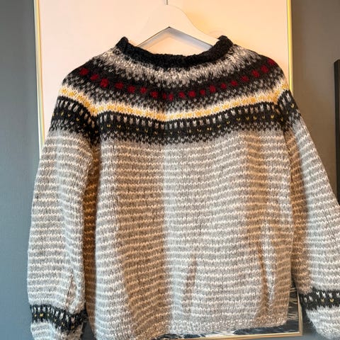 Selger nydelig strikket genser str. M. Pent strikket i fine farger. Strikket i Gjesdal Superwach garn. Fin til vinterferie og påske. Sender mot betaling av frakt.