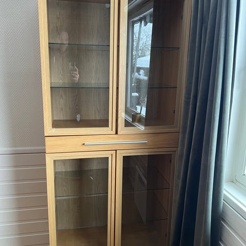 Vitrineskap med glassdør foran og glass på siden. Noen bruksmerker. Må hentes.