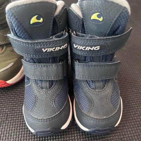 Viking vintersko i størrelse 24 unisex. Skoene har høy modell med snøring og borrelås øverst. Farge hovedsakelig mørk blå med røde detaljer og lys såle. Egnet som hverdagssko for barn, med god støtte rundt ankel og fot. Europeisk størrelse 24 (UK 7.0).