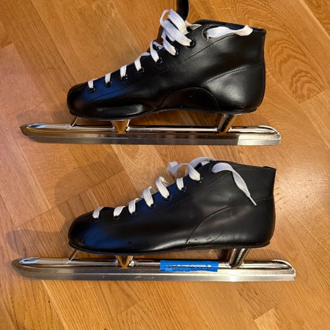 Skøyter i størrelse 42 i svart farge. Modellen har høyt skaft med snøring foran og lange stålskinner. Egner seg til generell skøytebruk på is, for eksempel tur og fritid. Passer for voksen fot rundt størrelse 42, avhengig av passform og sokketykkelse.