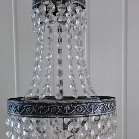 Dekorativ taklampe i tinnfinish med sommerfugldetaljer og hengende ornamenter.