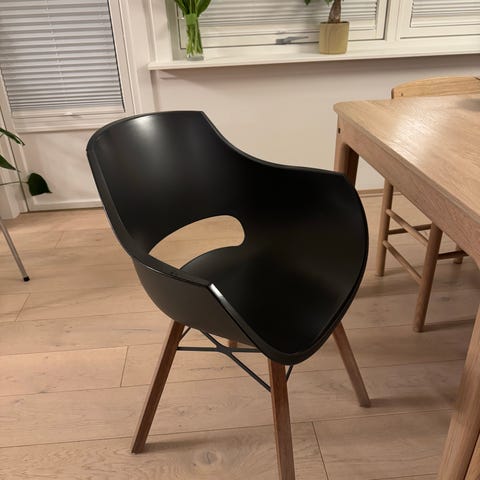 Selger tre stykker av designstolen Noor fra produsenten RBM. Det er det anerkjente svenske kollektivet Form us with love som står bak designet, som også har vunnet Red Dot Award.