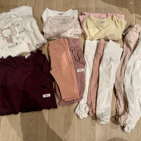 7 bodyer, 1 jakke/genser, et par tøfler, 4 stk bukser/leggings (1 med sokker).