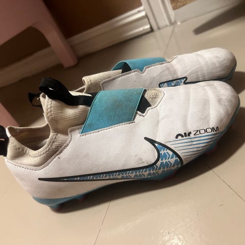 Nike fotballsko i hvit og turkis farge. Skoene har overdel med bred elastisk rem over vristen i stedet for tradisjonelle lisser. Yttersålen har faste knotter til bruk på gress eller kunstgress. Overdelen er i syntetisk materiale, og skoene har hempe bak for enklere av- og påkledning. Passer til kunstgress