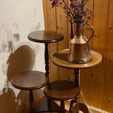 Liten lav krakk, pidestall, har blitt brukt under plantepotte. Med meget tykk plate og flotte detaljer
