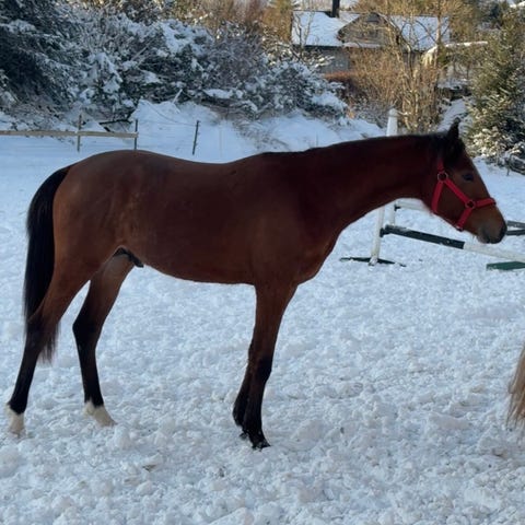 Sertifisert og fått de to første vaksinene. Går i flokk med to andre gjevngamle. Snill å leie. Har stått litt i kjetting og løftet bein. Selges til satsende innen trav. Nyere bilder kommer