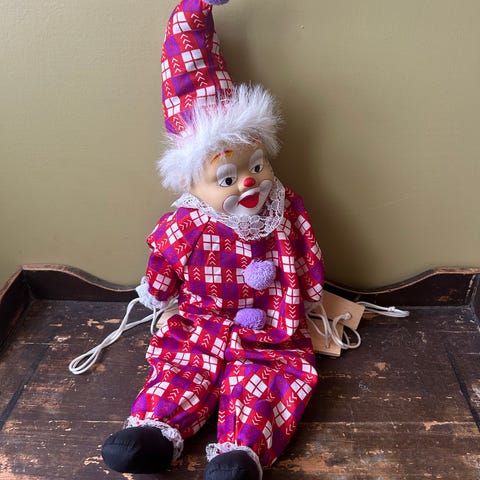 Klovnedukke med rød overdel og grønn bukse, pyntet med hvit blondekant. Dukken har malt ansikt med tydelige ansiktstrekk og lyst hår, samt grønn lue som matcher buksen. Egner seg som pyntegjenstand eller samleobjekt. Kan plasseres sittende eller stående, avhengig av underlag og støtte. Noe ødelagt på ene skoen, si siste bilde.
