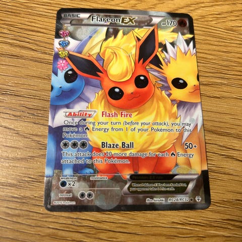 Pokémon Flareon EX RC28/RC32 samlekort. Kortet viser Flareon EX sammen med Vaporeon og Jolteon, med angrepene Flash Fire og Blaze Ball. Standard Pokémon-kortstørrelse. Egnet for samling eller spill i Pokémon Trading Card Game.