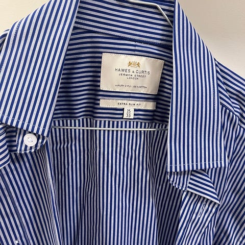 Selger 3 Dressmann skjorter i størrelse M, en lys blå, en hvit og en mer beige med små ruter. Den hvite er slim fit. Passer til både formelle og uformelle anledninger, og kan brukes alene eller under genser eller dressjakke.