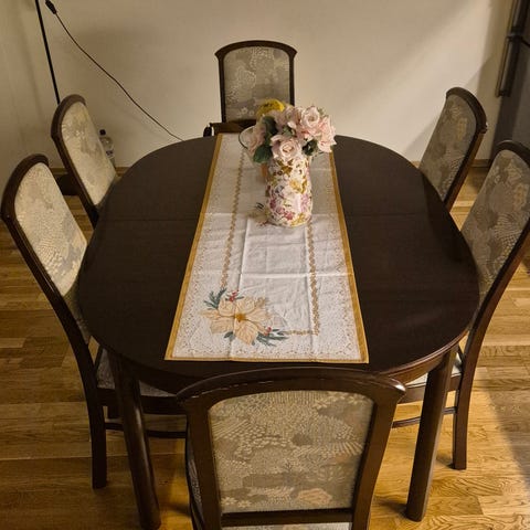 Solid bord med ileggsplater og 6 stoler inkludert. Må hentes