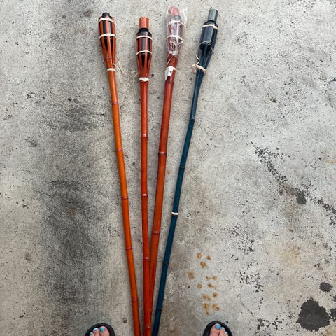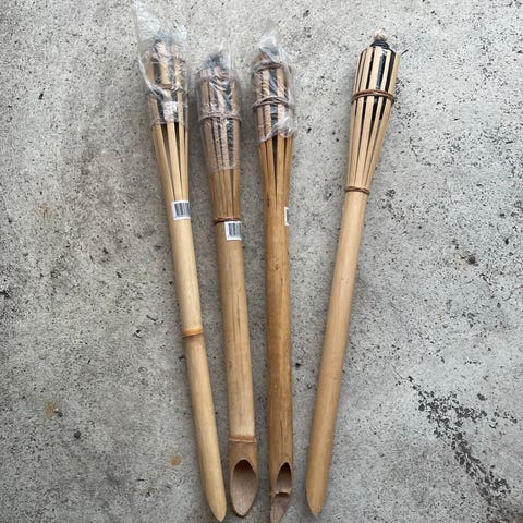 Har fem bambus fakler som selges. Veke med lampeolje. Vært til bruk på div arrangement.