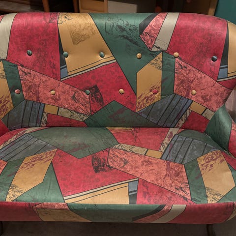 Sofa treseter i brun tekstil med utskårne detaljer i treverk. Sofaen har buede armlener og rygg, samt dekorative utskjæringer på front, sider og ben. Tekstilet har melert struktur i brune toner og litt turkise toner. Passer som sittemøbel i stue eller som blikkfang i et oppholdsrom. Bakside og sider er trukket i samme stoff som sete og rygg. Er et hull helt bederst i setet (se bilde). Har selv brukt puter i sofaen(se bilde), de kan du også få med deg om du ønsker det.