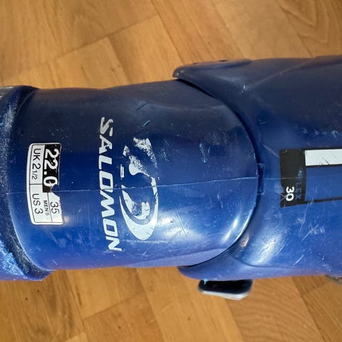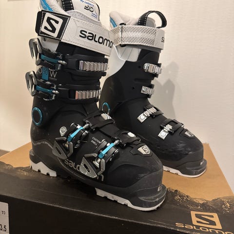Salomon alpinstøvler i størrelse 25–25,5 (sålelengde 296 mm). Støvlene er svarte med flere justerbare spenner i metall. De har polstret innersko og solid ytterskall som gir støtte til fot og ankel ved alpint bruk. Egner seg til bruk i alpinbakke med standard alpinbindinger.