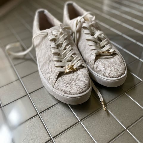 Selger et par Michael Kors monogram sneakers i størrelse 35. Skoene er lite brukt og fremstår som svært pene, uten synlig slitasje utover normal bruk.