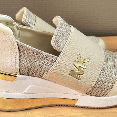 Modellen har klassisk MK-signaturmønster i lys beige/krem, med elegante gulldetaljer på lissene og logo både foran og bak. Komfortabel passform og lav profil som gjør dem enkle å style til både hverdagsantrekk og penere antrekk.