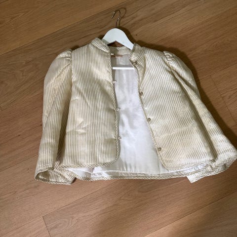 byTiMo jakke for dame i størrelse M. Jakken er beige og laget i polyester. Modellen har strukturert stoff med vertikale striper og dekorative knapper i front. Ermene har lett puff, og jakken er kortere i fasongen. Passer som lett ytterjakke eller som blazer-lignende plagg over kjoler og topper.