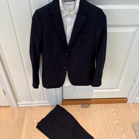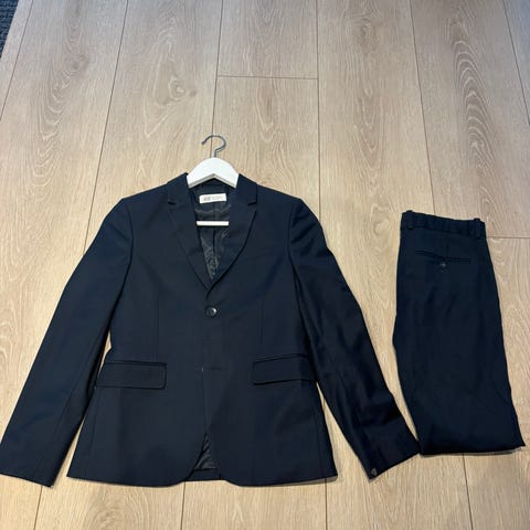 Dressjakke og dressbukse str. 121 fra Zara. Veldig mørkeblå, nesten svart.