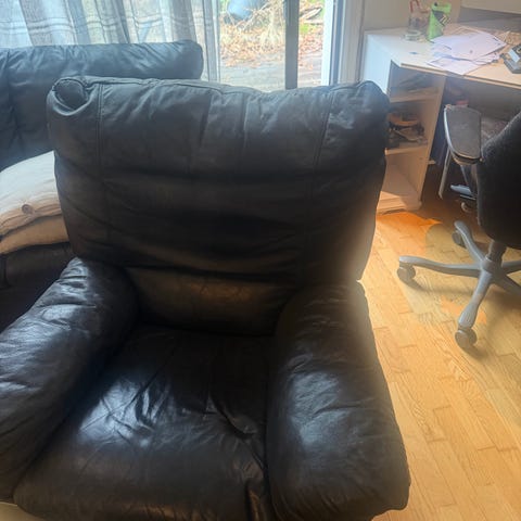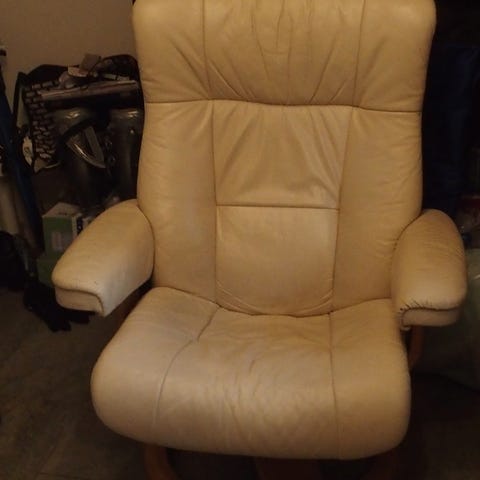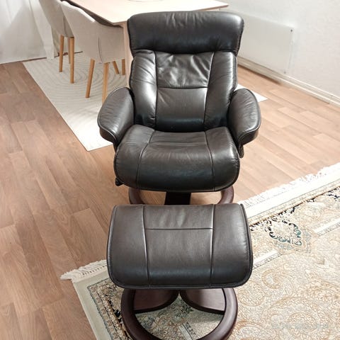 Pen grå Recliner i skinn med en praktisk svingfunksjon og en integrert fothviler. Sokker er rund i brun utførelse. Stolen er kjøpt hos Fagmøbler Knarvik.