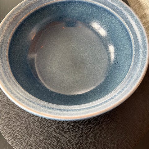 Ny pris! Nydelig skål fra Egersund Fayance i blått og brunt rillet/stripet mønster. Mål: 17,5 cm i diameter og 8 cm høy. Meget fin.