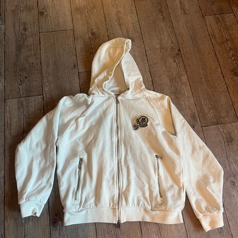 Moncler hettegenser for herre i størrelse M. Genseren er grå og laget av bomull. Modellen har glidelås i front, hette med snøring og ribbestrikkede kanter. Klassisk Moncler-logo er plassert på ermet. Passer til hverdagsbruk og som et lag over t-skjorte eller skjorte i kjøligere vær. Prisen kan diskuteres ved rask handel:)