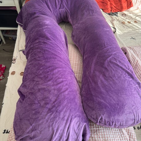 kroppspute i grå farge. U-formet pute som gir støtte langs hele kroppen. Trekket ser ut til å være i et glatt tekstilmateriale. Egnet som støttepute i seng, for eksempel ved behov for ekstra støtte til rygg, mage, hofter eller ben.