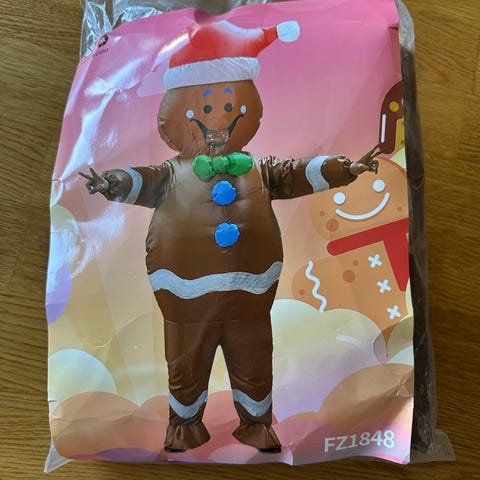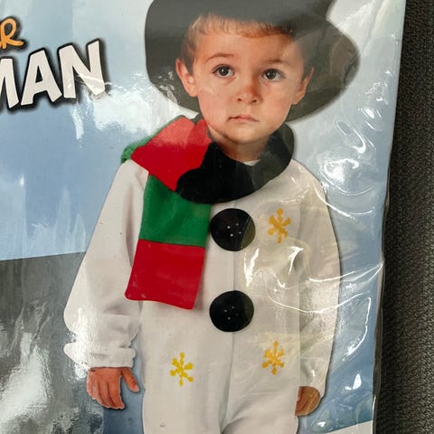 Ukjent merke oppblåsbar snømann kostyme for unisex voksen. Kostymet forestiller en hvit snømann med grønn hatt, rød skjerf og røde detaljer. Passer for voksne med høyde ca. 160–190 cm (63–75 tommer). Leveres i plastpose med bruksanvisning og sikkerhetsinformasjon. Egnet som utkledning til jul og vinterrelaterte arrangementer for voksne.