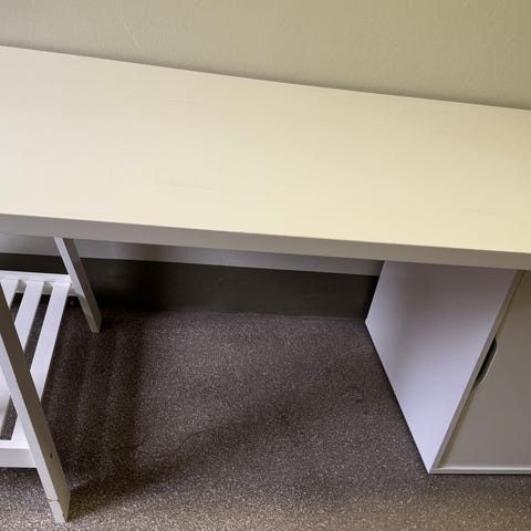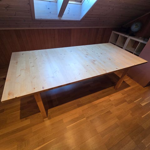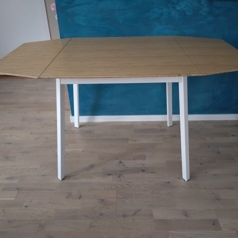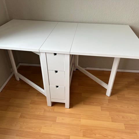 Ikea Norden bord med klaffer. I god stand bortsett fra den ene siden som ble oppripet under frakt (se siste bilde) kan enkelt pusses og dekkes til med hvit maling. Nypris 2795,- Man bør være to som henter da det er litt tungt, men jeg har heis og hjelper til å få det ned :)