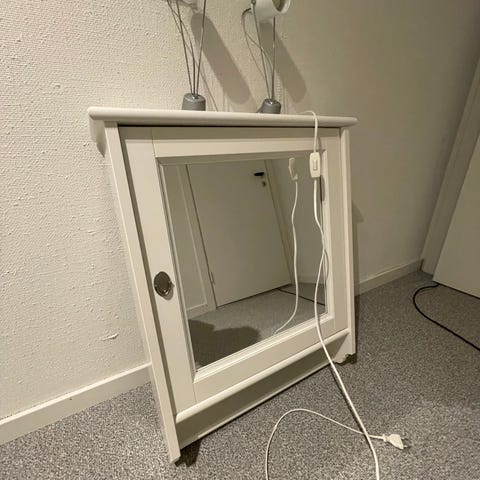 Helt og fint vitrineskap med to glassdører og en skuff.