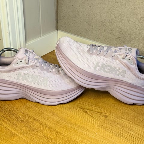 Hoka løpesko i størrelse 38. Modellen har overdel i pustende meshmateriale og tykk mellomsåle for demping. Fargekombinasjon i blå og lilla med hvit såle. Egnet til løping og annen trening på hardt underlag.