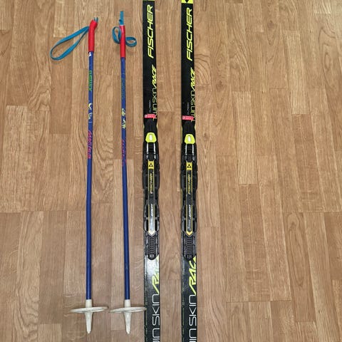 Fischer langrennski med tilhørende staver. Skiene har bindingssystem for langrenn og såle tilpasset preparerte løyper. Staver i aluminium med plasttrinse og håndreim. Egner seg til klassisk langrenn på tur og trening.