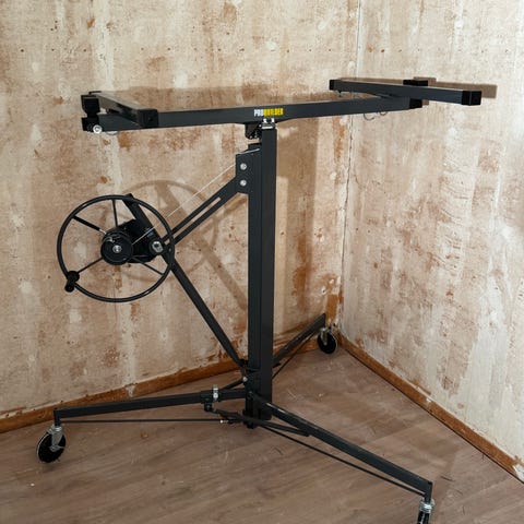 Probuilder gipsplateheis (gipsheis) i stål leies ut. Sammenleggbar konstruksjon med hjul for enkel forflytning. Heisen har håndhjul for justering og låsing av høyde og vinkel, samt støttearmer for feste av plater. Egnet til montering av gipsplater og andre plateprodukter i tak og på vegg på byggeplass eller ved oppussing. Leveres demontert som vist på bilde. Heisen er godt brukt, men fungerer veldig fint. Kan være behjelpelig med frakt etter avtale mot tillegg i pris.