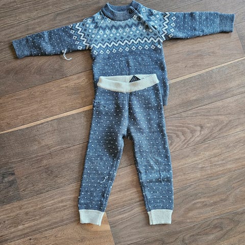Name it ullsett for barn i størrelse 98. Sett med genser og bukse i grå ull. Genser med mønster og rund hals, ribbekanter i ermer og nederkant. Bukse med strikk og snøring i livet, samt ribb nederst på bena. Unisex-modell egnet til hverdagsbruk og som innerlag på kjølige dager.