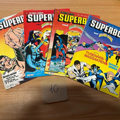 Superboy tegneserieblader. To hefter med fargerike omslag og historier om Superboy og andre figurer fra superheltuniverset. Egnet for samlere av eldre tegneserier og lesere som er interessert i superheltserier.