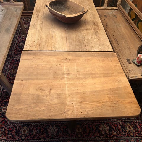 Antikt langbord i tre med rektangulær bordplate i naturfarget treverk og understell med original maling. Bordet har kraftige ben med gjennomgående tverrstag som gir stabil konstruksjon. Overflaten på bordplaten har synlige kvister og bruksmerker som gir et rustikt preg. Passer som spisebord i stue eller kjøkken, og kan også brukes som arbeidsbord. Forholdsvis lite og nett bondenord.