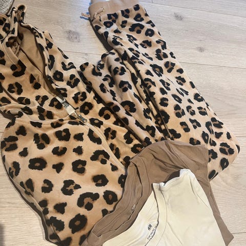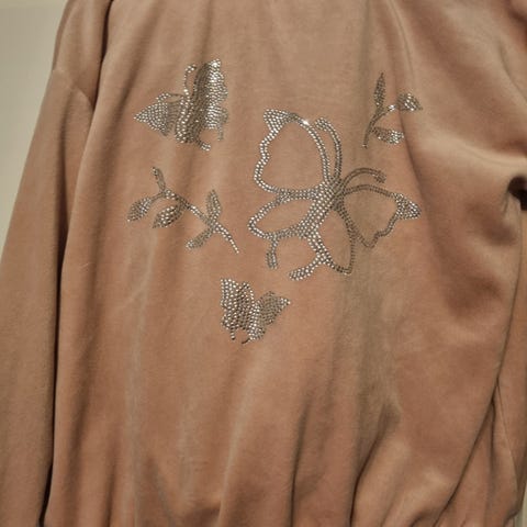 Gammelrosa med sort mønster. Genseren er lengre bak en foran, se bilder. Mykt og godt sett.