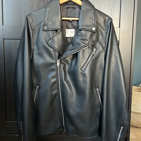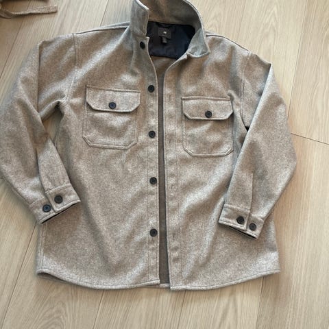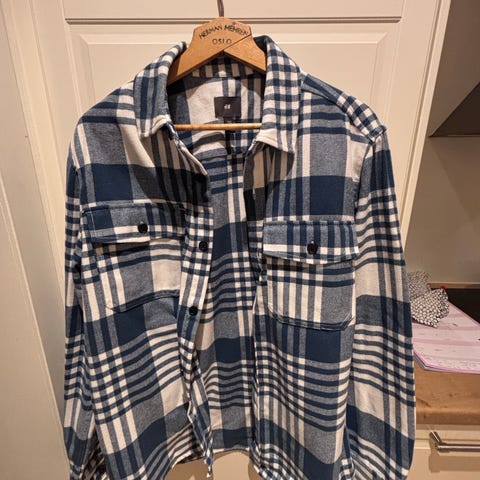 H&M jakke for herre i størrelse L. Jakken er laget i polyester og har et rutete, flerfarget mønster i mørke og lyse toner. Modellen har krage, knappelukking foran og brystlommer med klaff. Passer som lett ytterjakke eller overskjorte i hverdagen.