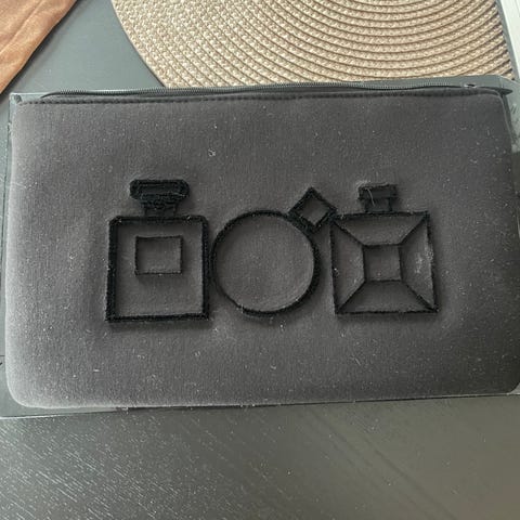 Lancôme toalettmappe i rød farge. Vesken har glidelåslukking og et innvendig fôr med mønster i røde og blå toner med øyemotiv. Egnet til oppbevaring av kosmetikk, toalettartikler eller småting ved reise og hjemmebruk.