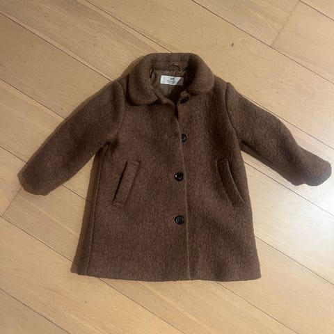 Benetton kåpe for jente i størrelse 104. Kåpen er laget i polyesterlignende stoff og har en lilla farge. Modellen er en vattert, knelang kåpe med hette og markert innsnitt i midjen. Den har glidelås foran kombinert med trykknapper/store knapper. Ermene er lange, og det er fleeceforede varme lommer i sidene. Passer som yttertøy til barn i overgangs- og kaldere sesonger, avhengig av hva som brukes under.