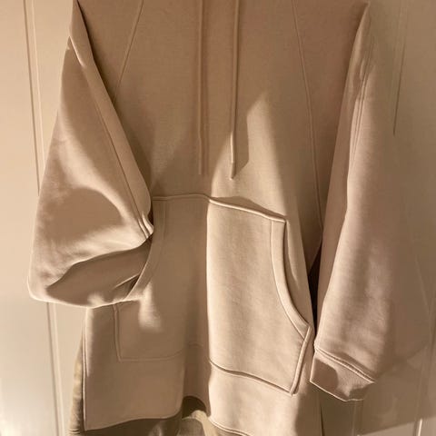 One size kul genser i beige fra Mys by Mari. Avbildet med en hvit topp med blonder på ermene som KAN selges ved interesse og tillegg i pris.