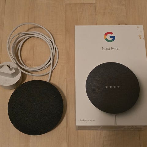 Google Nest Mini smart-høyttaler i grå farge. Leveres komplett i original eske med strømadapter og kabel som vist på bildene.
