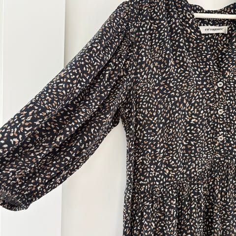 Co'couture hverdagskjole for dame i størrelse M. Kjolen er svart og laget i viskose. Den har V-utringning , lommer og er knelang med løs passform. Ermene er trekvartlange med rynkedetaljer. Passer til hverdagsbruk og enkle anledninger.