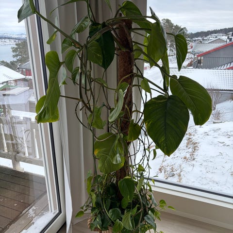 Monstera deliciosa potteplante i grønn farge. Planten har kjempe store flikete blader med karakteristiske hull. Jeg har gitt bort stiklinger fra disse plantene til andre som har fått like fine og store med hull. vokser i potte til innendørs. disse er mange år gamle men vokser like fine nye (passer på å ha mye sol lys)