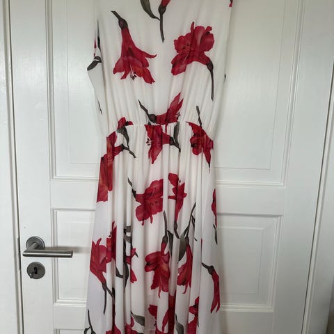 Rosa kjole med blomster og flamingo selges, står XL men tilsvarer en L da den er litt liten i str. Veldig lite brukt.