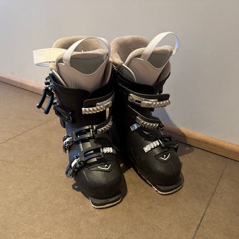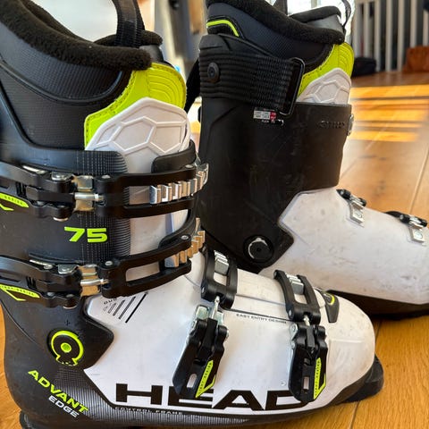 Head Advant Edge alpinstøvler i størrelse 26-26,5 og Flex 75, egnet for middels myk støvelfølelse. Støvlene har fire justerbare spenner og powerstrap øverst for bedre tilpasning rundt leggen. Fargekombinasjon hvit og svart med gule detaljer. Innerstøvel i polstret materiale for komfort og støtte.