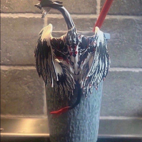 Drikkebeger fra Avatar The Last Airbender med lokk og sugerør. Inkluderer en dekorativ fugl som er del av designet. Fargen på begeret er hovedsakelig grå med røde og svarte detaljer.