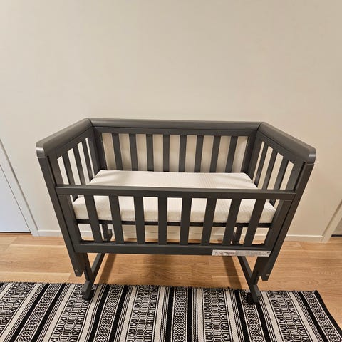 Kinderkraft bedside crib for spedbarn. Sengen er i grå tekstil med nettingpaneler på sidene som gir lufting og innsyn til barnet. Den står på stabile ben med justerbar høyde, slik at den kan tilpasses voksenseng. Madrass følger med, med avtagbart trekk. Egner seg som babyseng ved siden av foreldreseng eller som frittstående liten barneseng i soverommet.